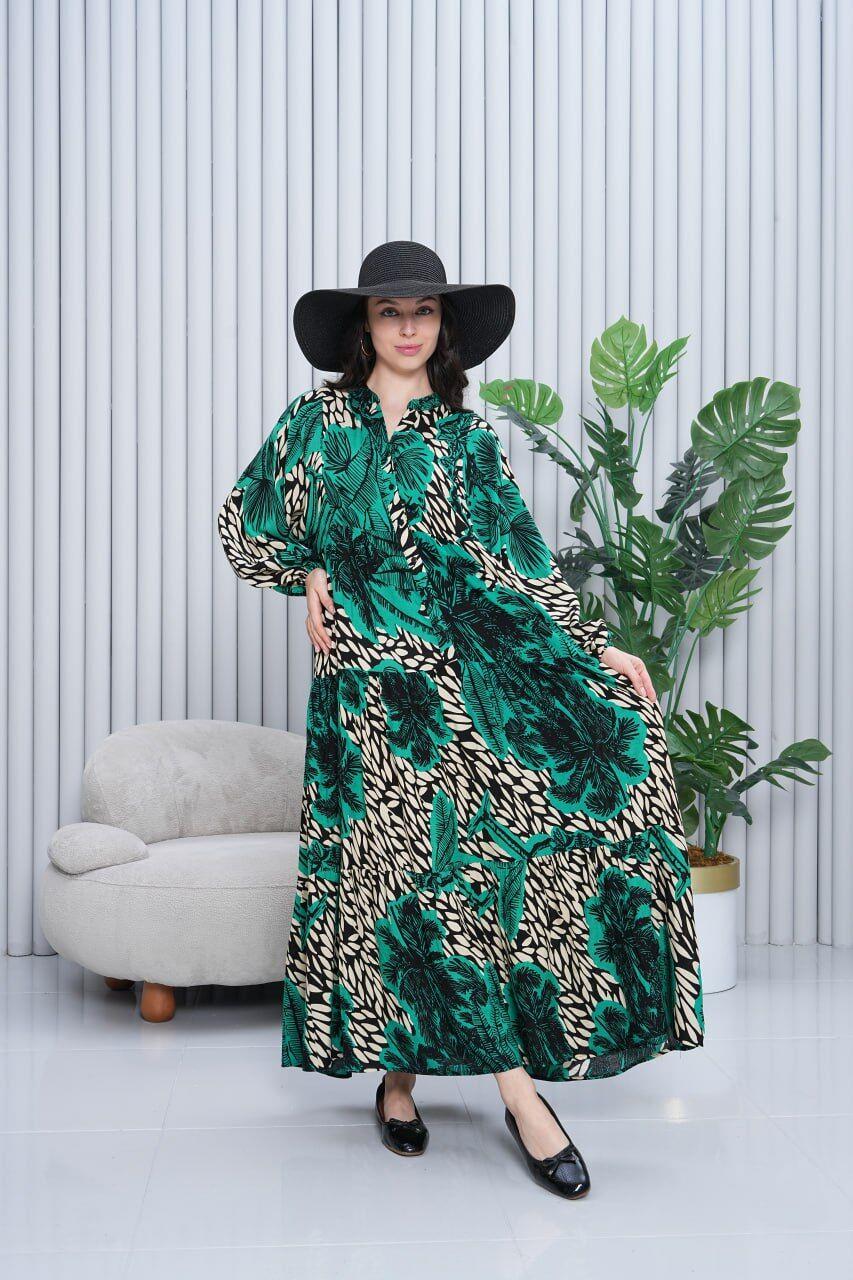 Bu desenli viskon elbise, zarif yeşil-siyah-krem tonlarıyla dikkat çekiyor. İster günlük giyimde, ister özel bir davette şıklığınızı tamamlamak için ideal bir seçenek. Hafif ve rahat yapısıyla her mevsim kullanabileceğiniz bir parça. Gardırobunuzun vazgeçilmezi olmaya aday!