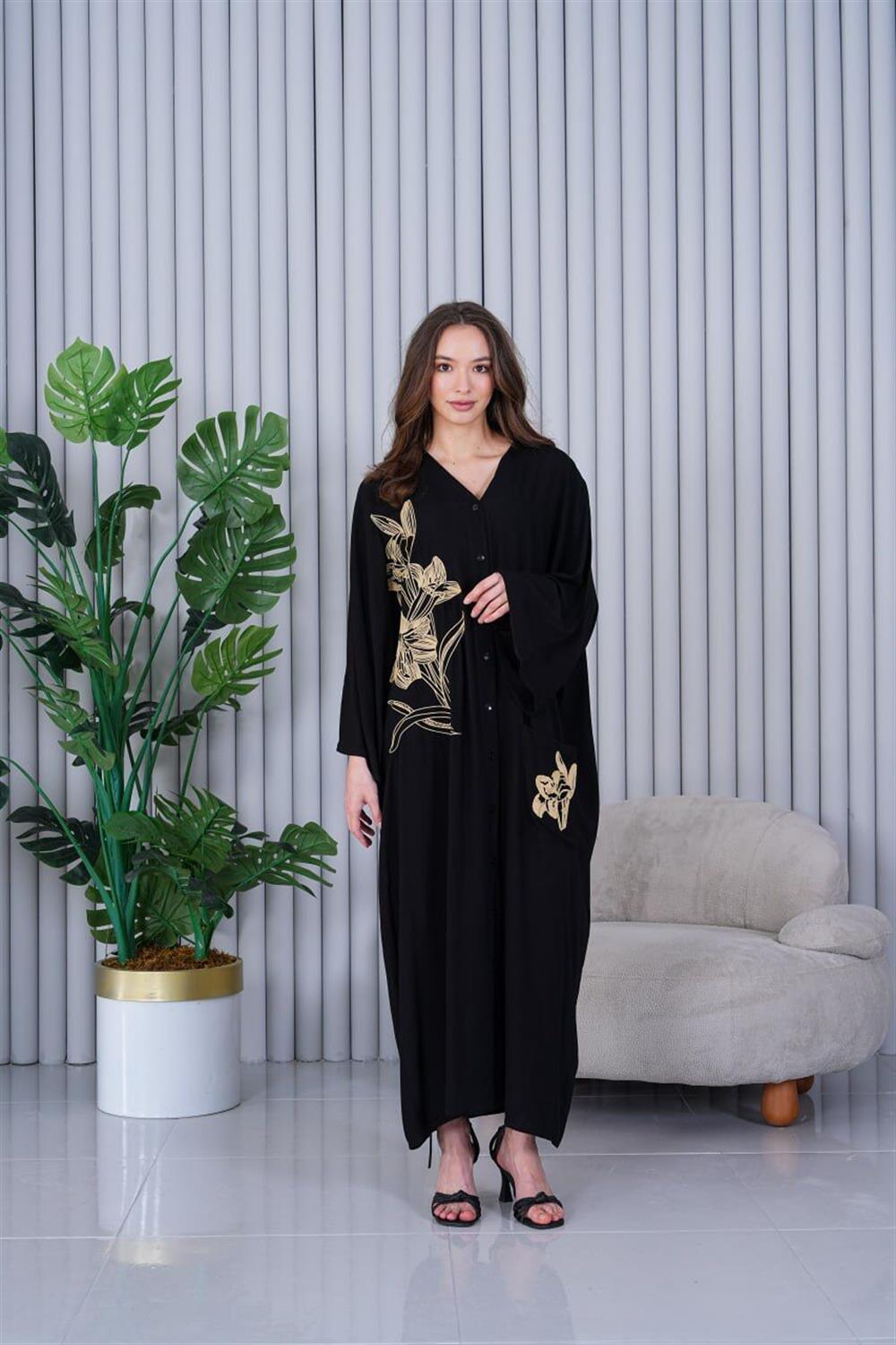 Düğmeli Büyük Çiçek Nakışlı Elbise