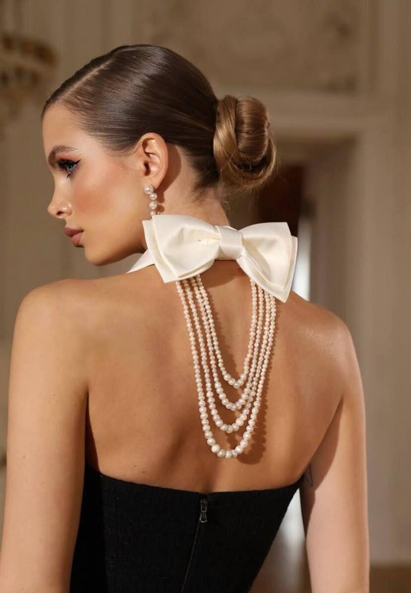 Bu siyah mini elbise, incili sırt dekoltesi ve fiyonk detayıyla dikkat çekiyor. Zarif ve şık tasarımı ile her türlü özel etkinlik için mükemmel bir seçenek. Tarzınıza şıklık katmak istiyorsanız bu elbiseyi tercih edebilirsiniz.