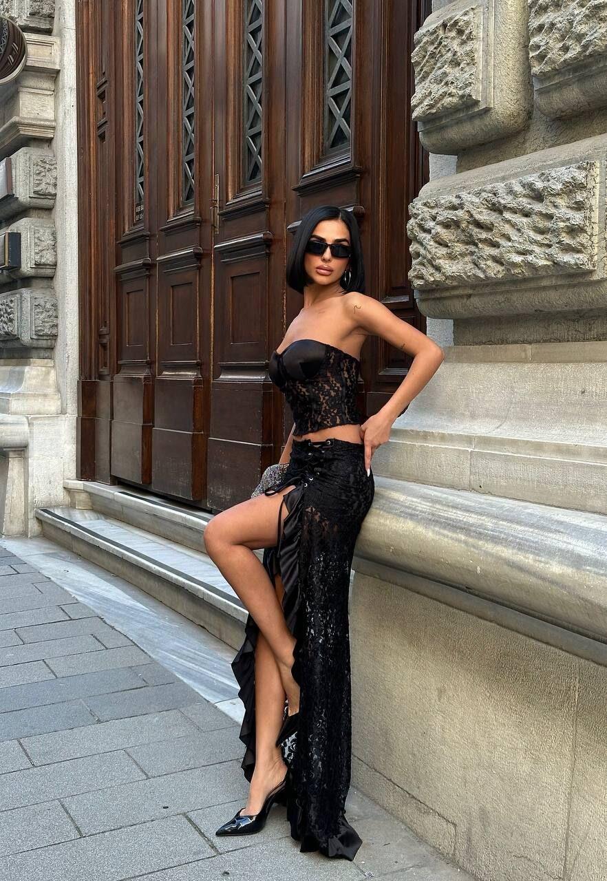 Bu muhteşem kuşgözü detayıyla tasarlanmış dantel etek büstiyer kombini, zarif ve çekici bir görünüm sunuyor. Dikkat çekici dantel detayları, zarif etek ve büstiyer ile mükemmel bir uyum sağlıyor. Bu kombin, herhangi bir özel etkinlik için mükemmel bir seçenektir ve tarzınızı vurgulamak için idealdir.