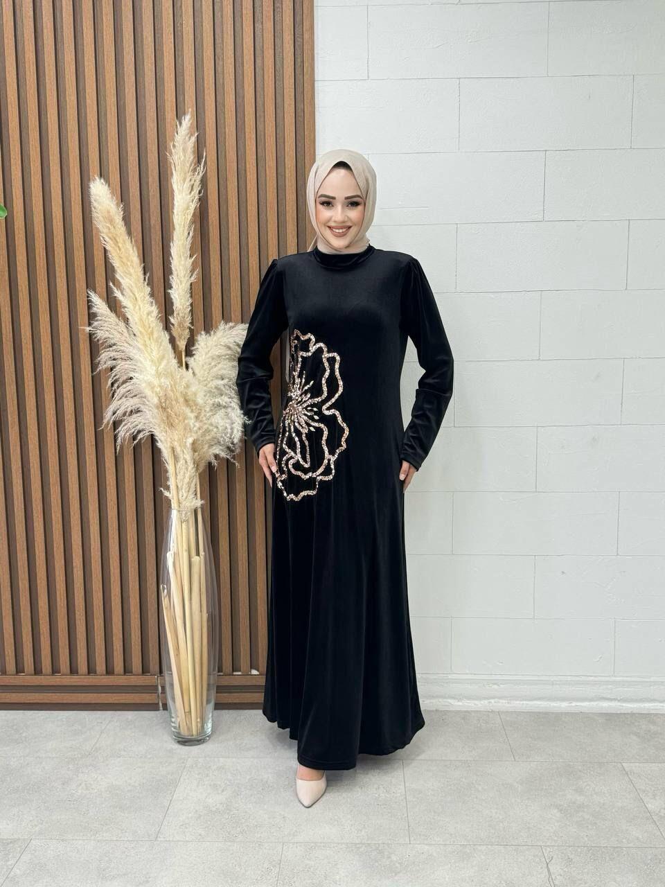 Bu şık kadife elbise, dik yaka ve bel payeti detaylarıyla tasarlanmıştır. Vatkaları ve zarif kesimi ile özel günlerinizde ve davetlerde şıklığınızı tamamlayacak bir seçenektir. Kadife kumaşıyla da hem şıklık hem de rahatlık sunar.