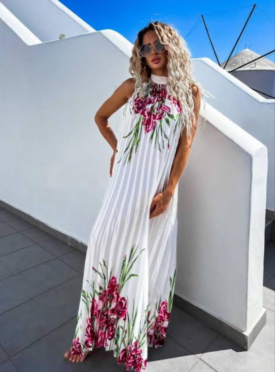Piliseli Çiçek Desenli Uzun Elbise Beyaz