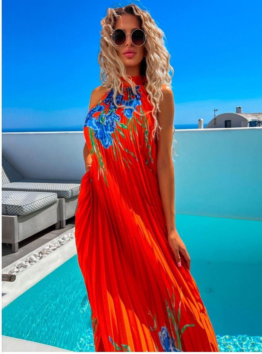Piliseli Çiçek Desenli Uzun Elbise Turuncu