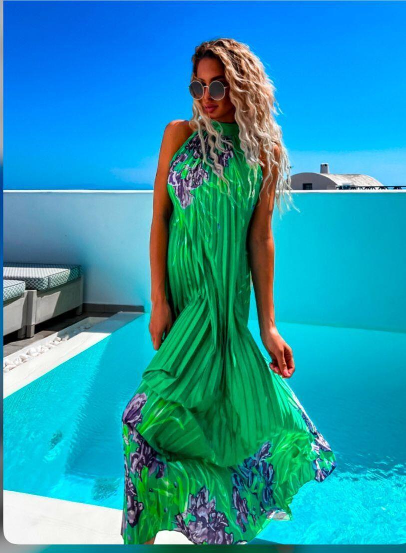 Piliseli Çiçek Desenli Uzun Elbise Yeşil