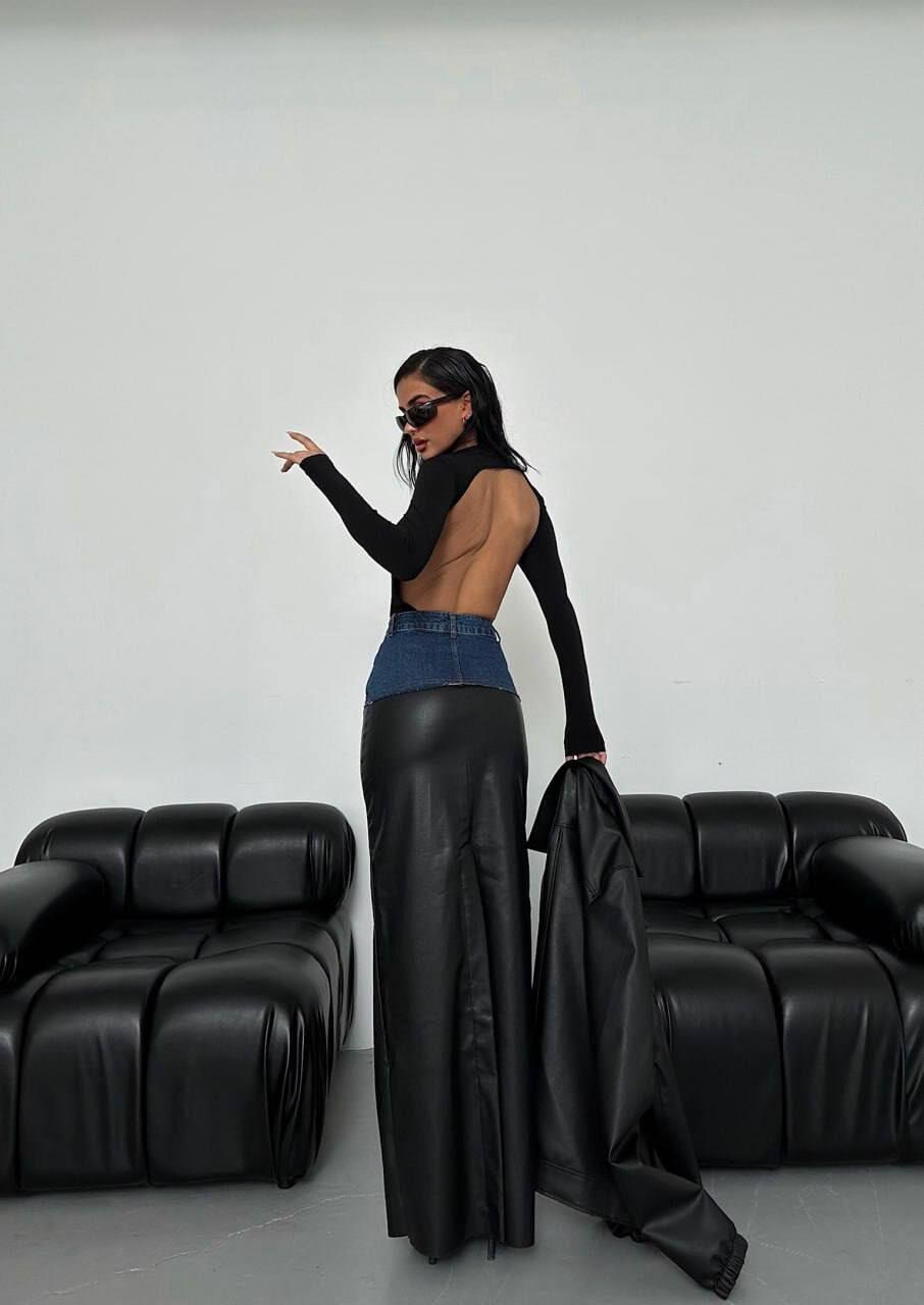 SUNİ DERİ SİYAH ETEK KOT DETAYLI