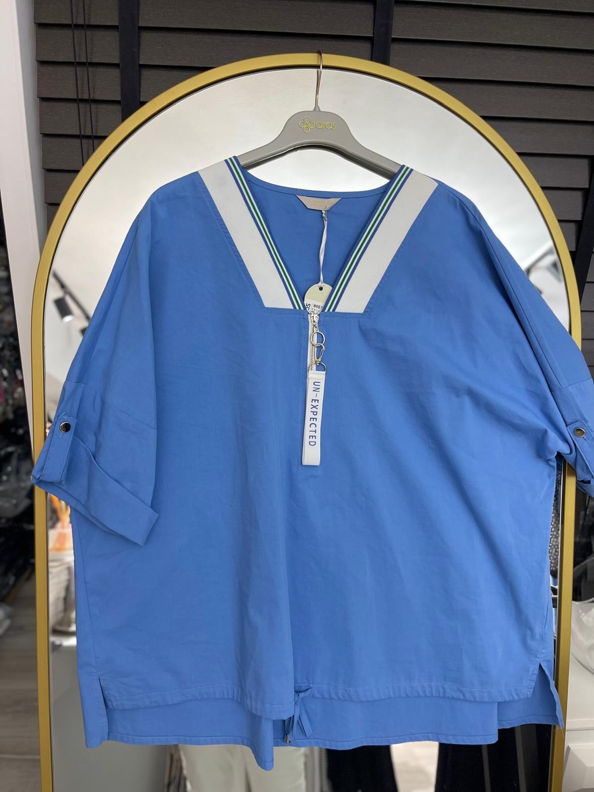 V Yaka Fermuarlı Beli Büzgülü Bluz