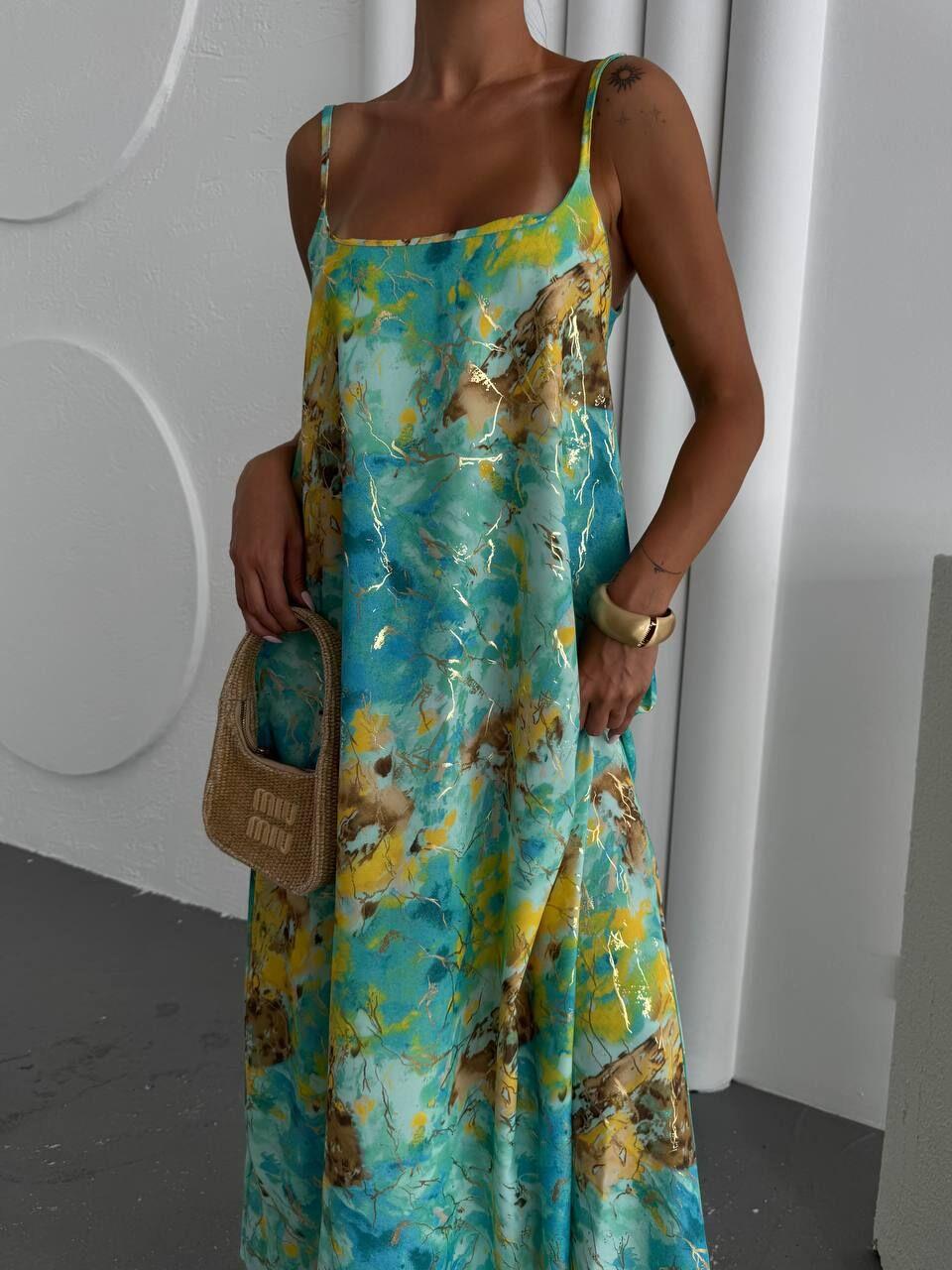 Varaklı Baskılı İnce Askılı Maxi Elbise